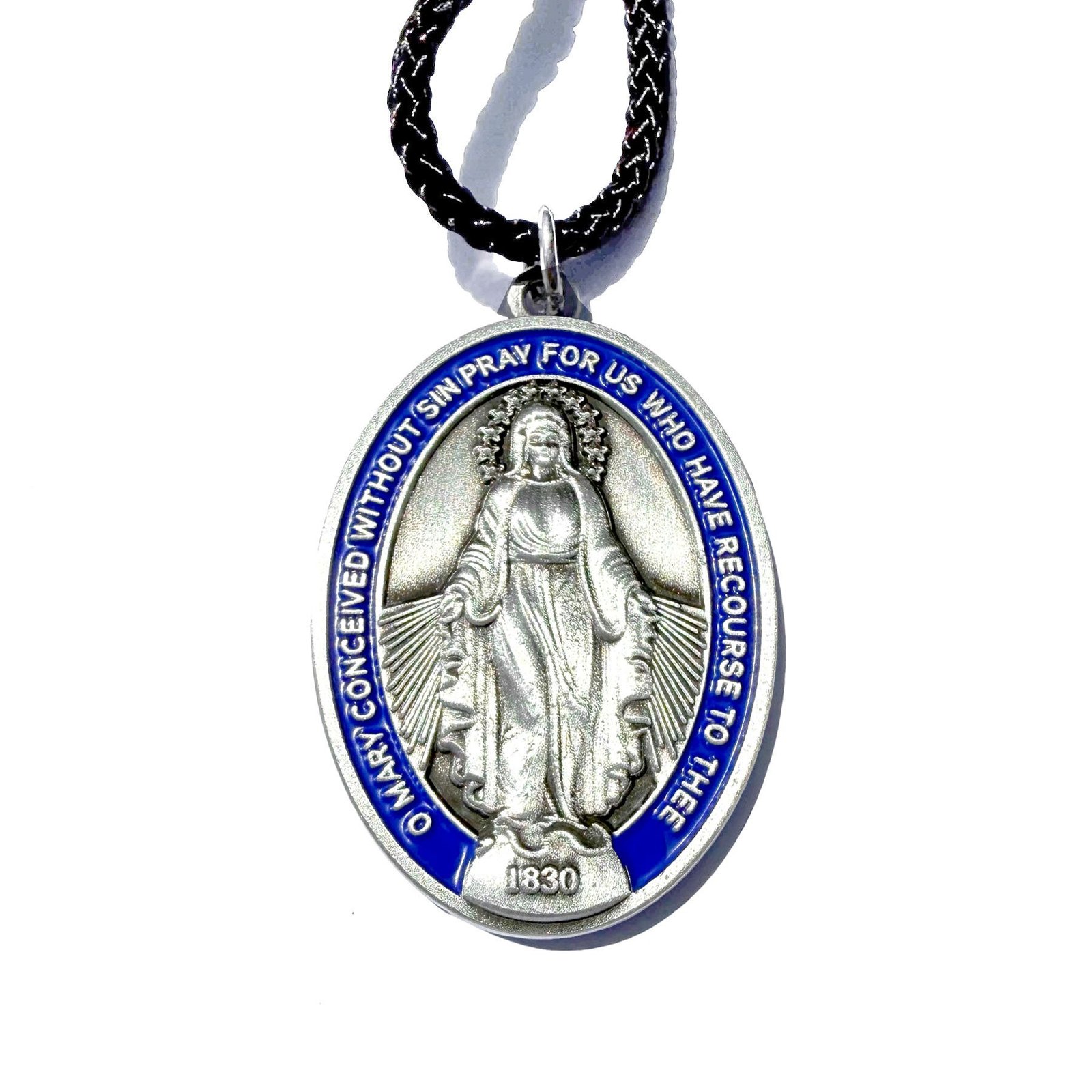This Miraculous medal is a double sided medal with enamel filled zinc alloy with antique silver finish. Front side shows image of Mary and on the Back of the medal is the Symbol for Mary.