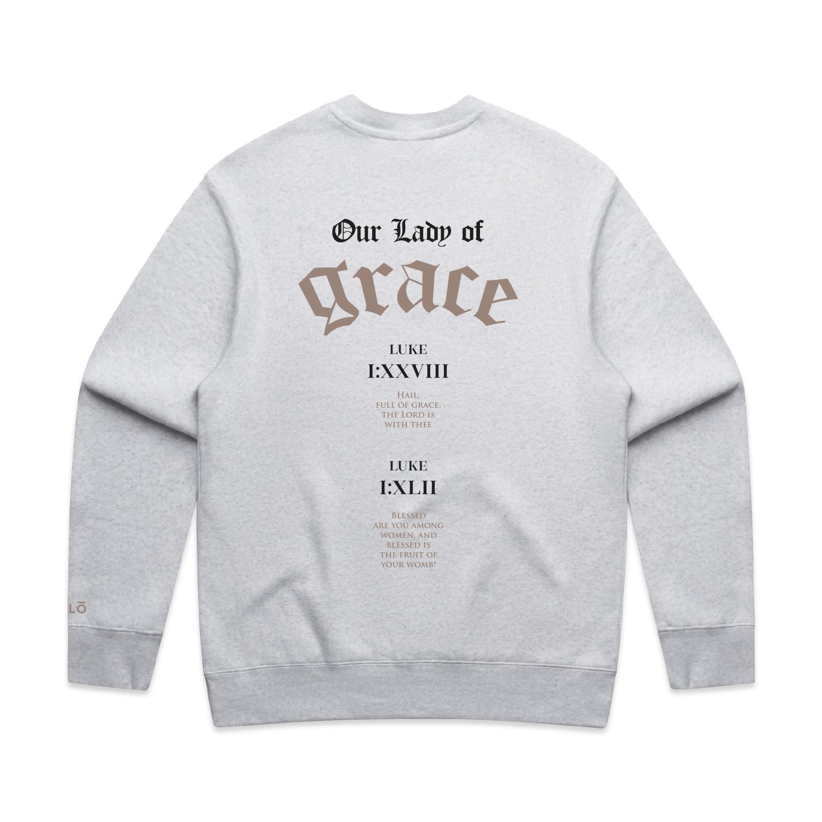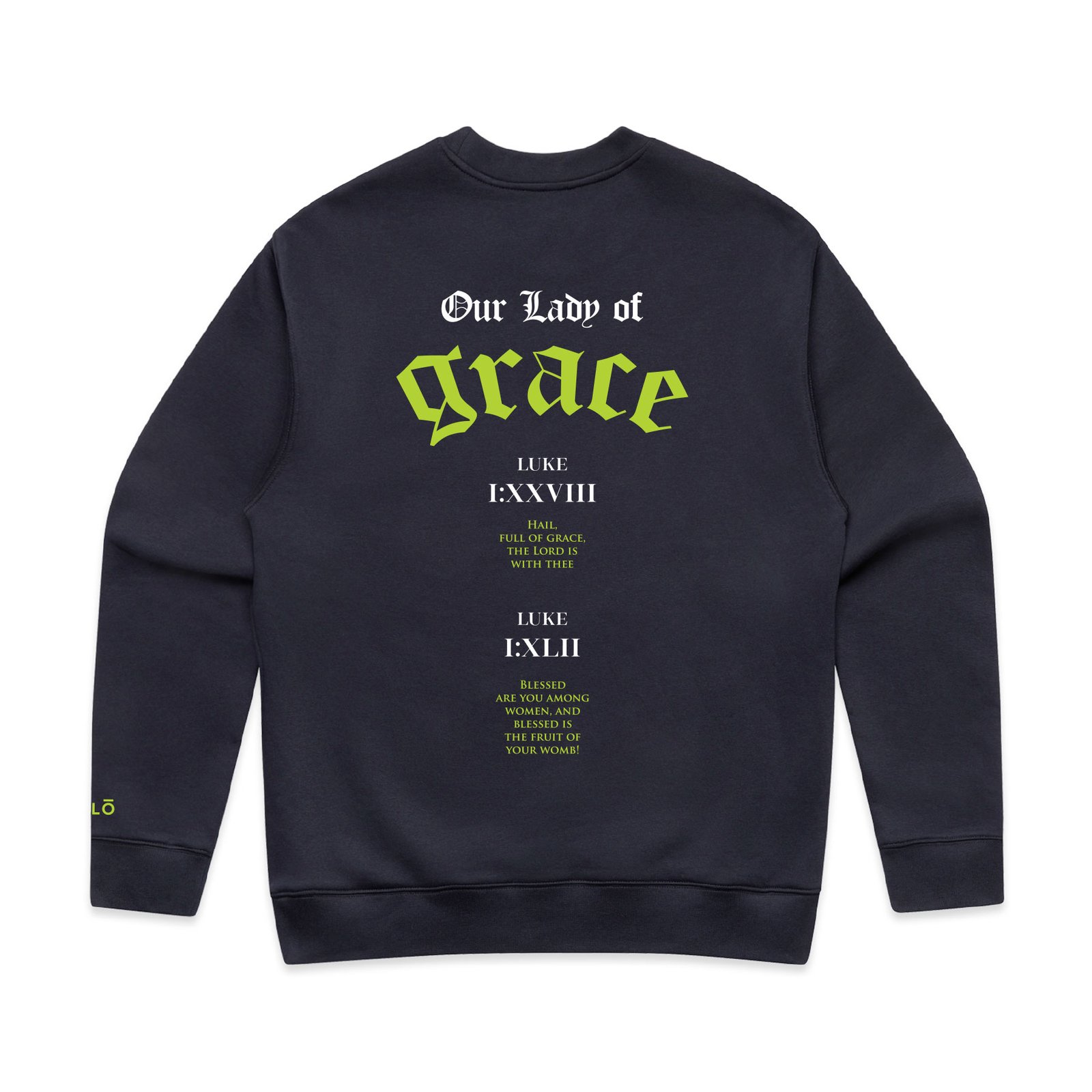 Bold devotion meets timeless scripture. Two key biblical references from the Gospel of Luke celebrate the Virgin Mary with a sense of reverence and strength. Perfect for those who wear their faith out loud.