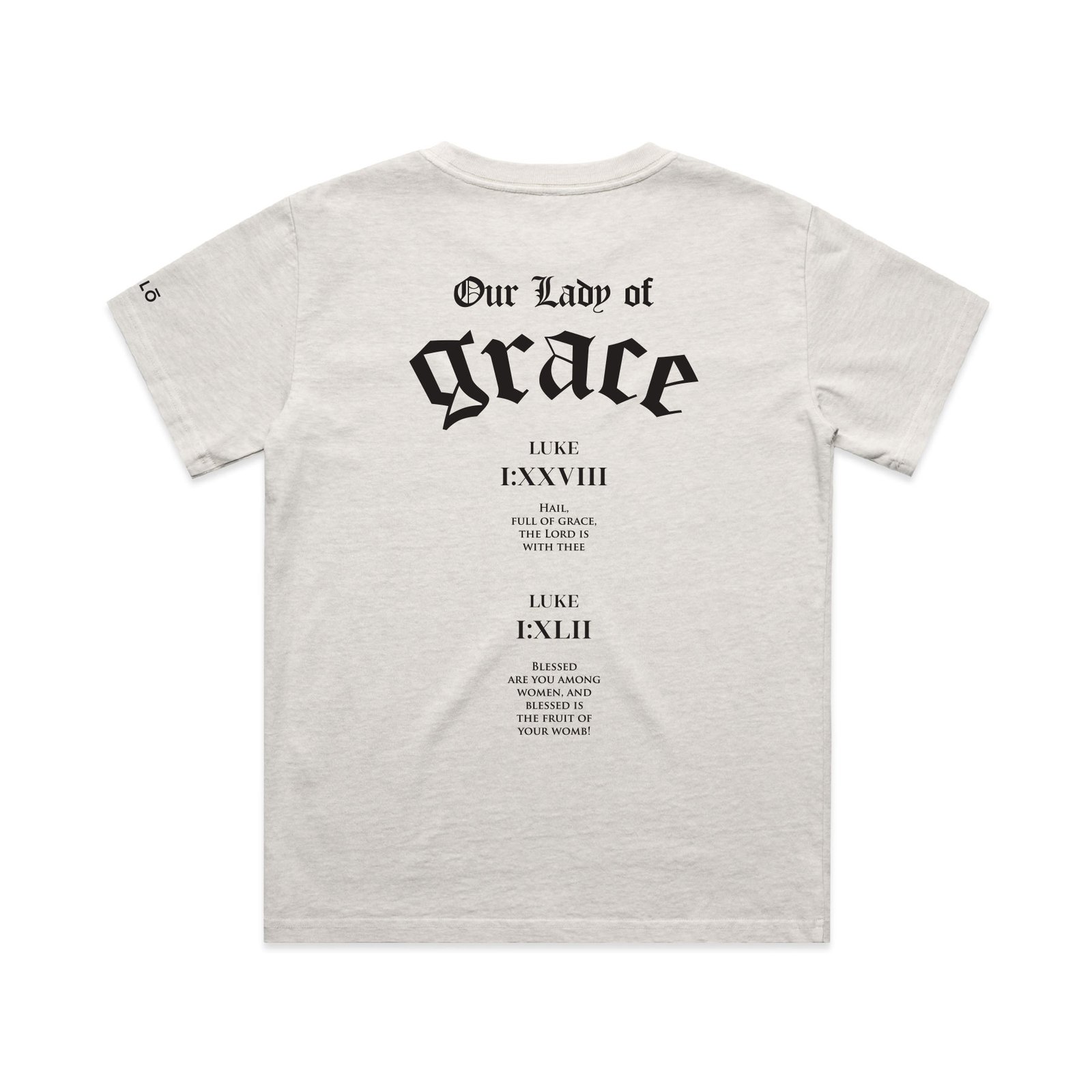 Bold devotion meets timeless scripture. Two key biblical references from the Gospel of Luke celebrate the Virgin Mary with a sense of reverence and strength. Perfect for those who wear their faith out loud.