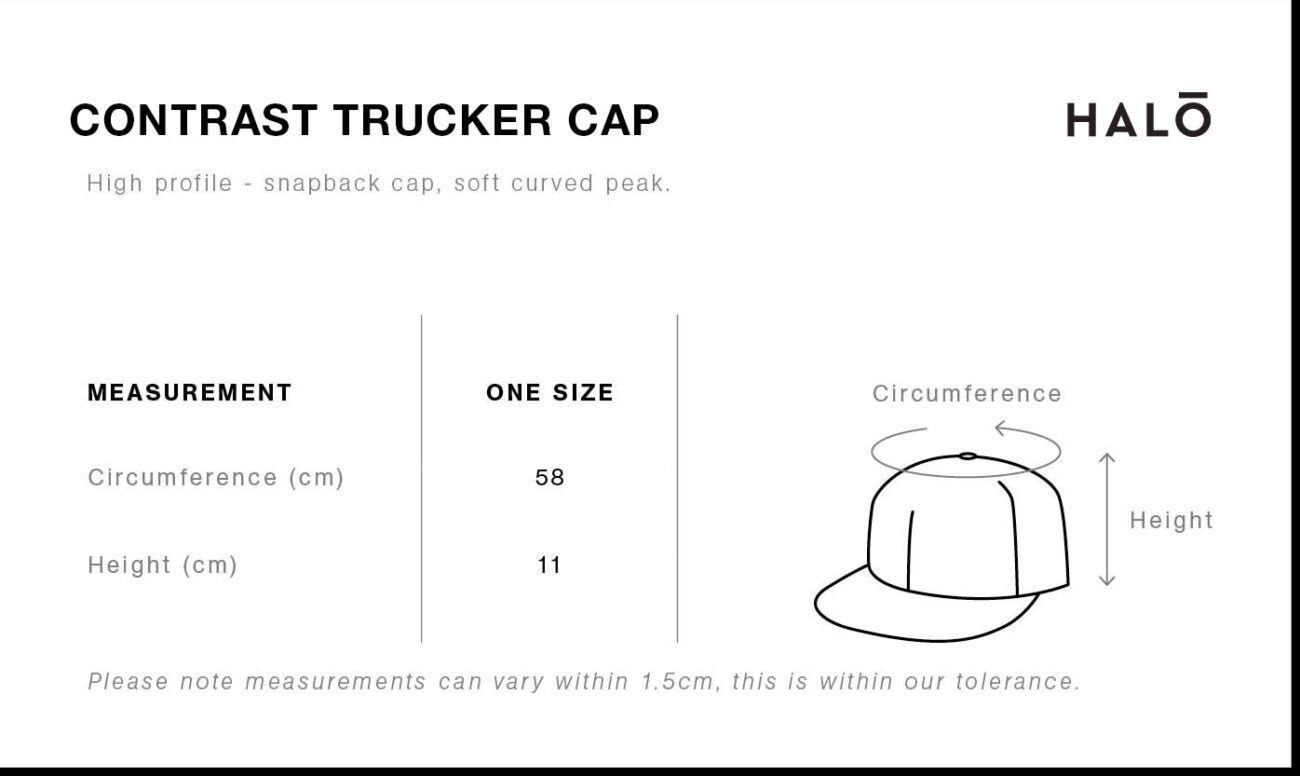 Our St Charbel Contrast Trucker Cap is a High-profile, snap back cap. Featuring a contrast mesh back, plastic snap back and tonal under-peak lining.