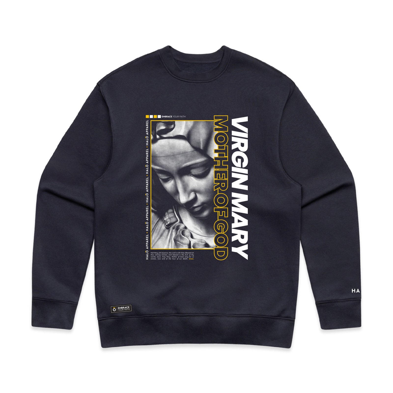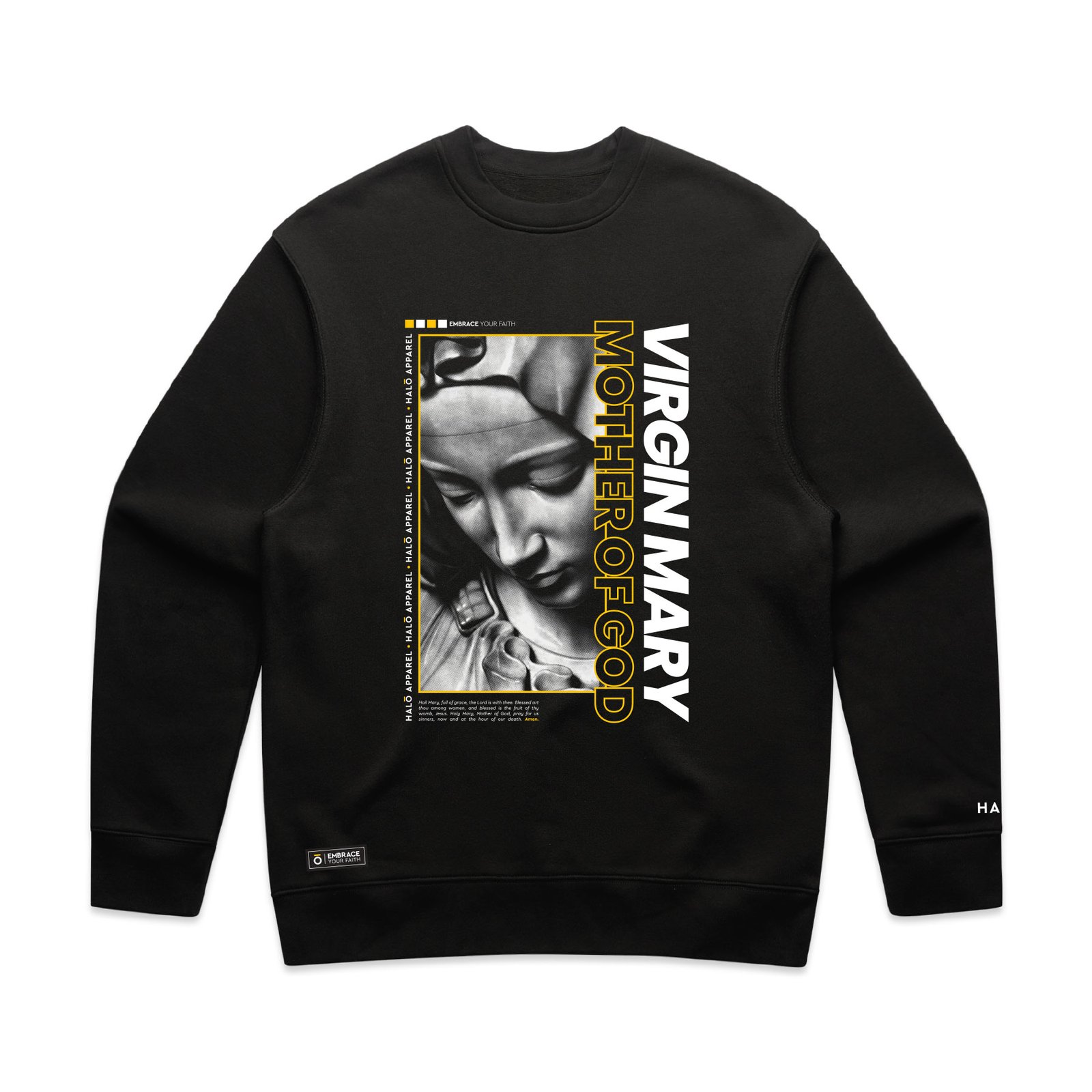 This design centres on the Virgin Mary — a symbol of purity, strength, and grace. It’s a bold way to embrace your faith and carry it with reverence.