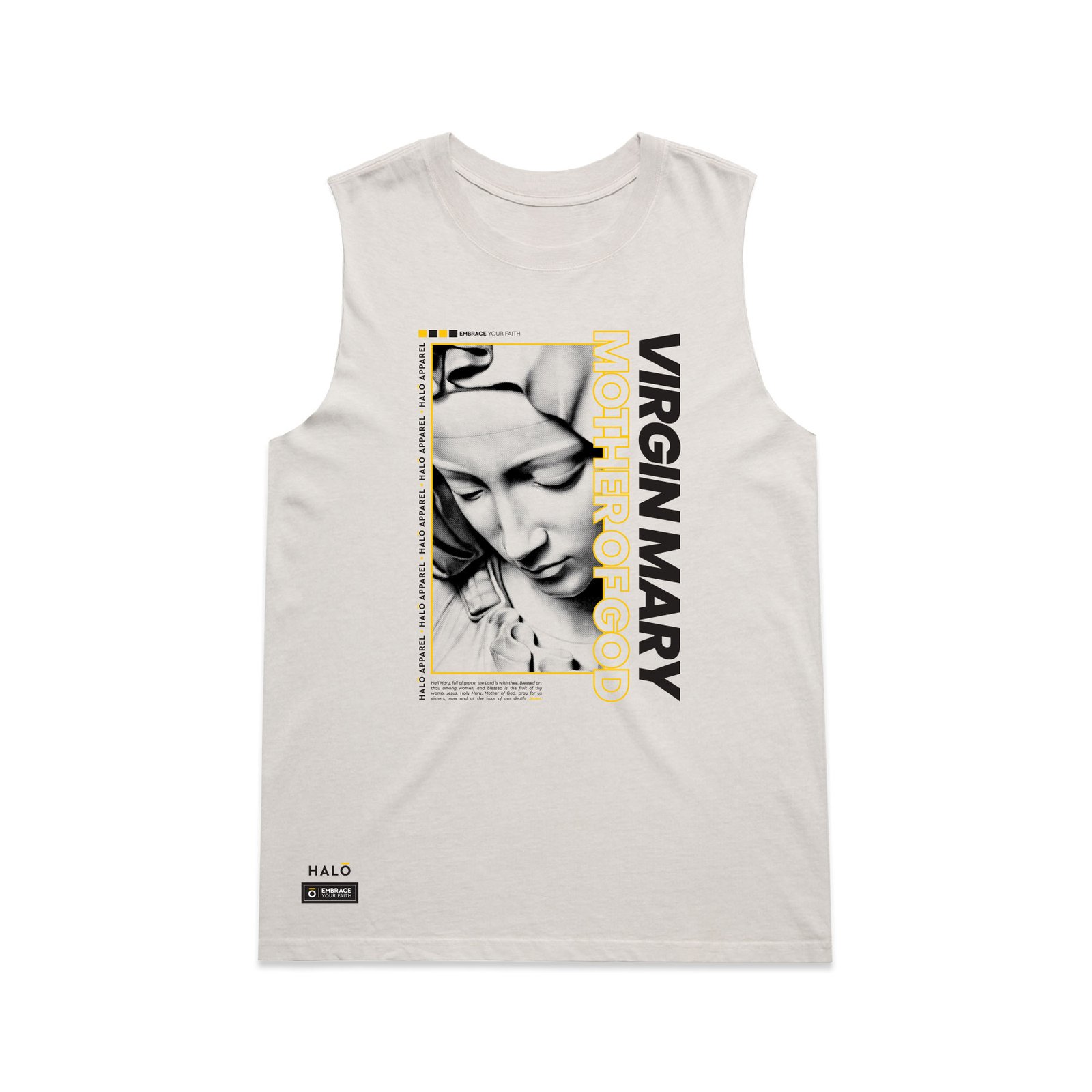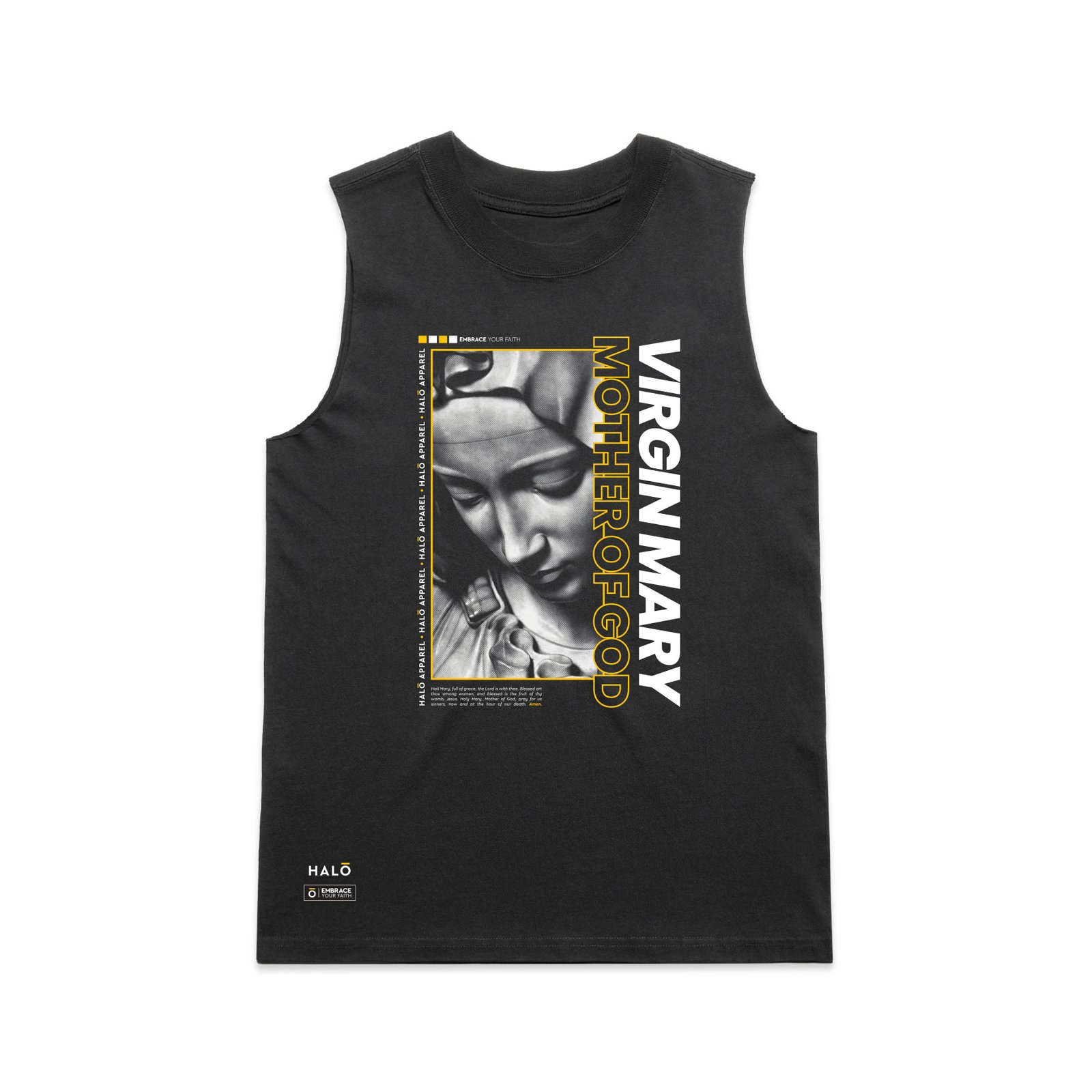 This design centres on the Virgin Mary — a symbol of purity, strength, and grace. It’s a bold way to embrace your faith and carry it with reverence.